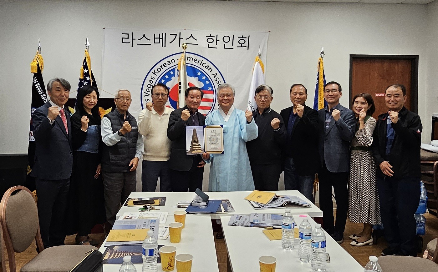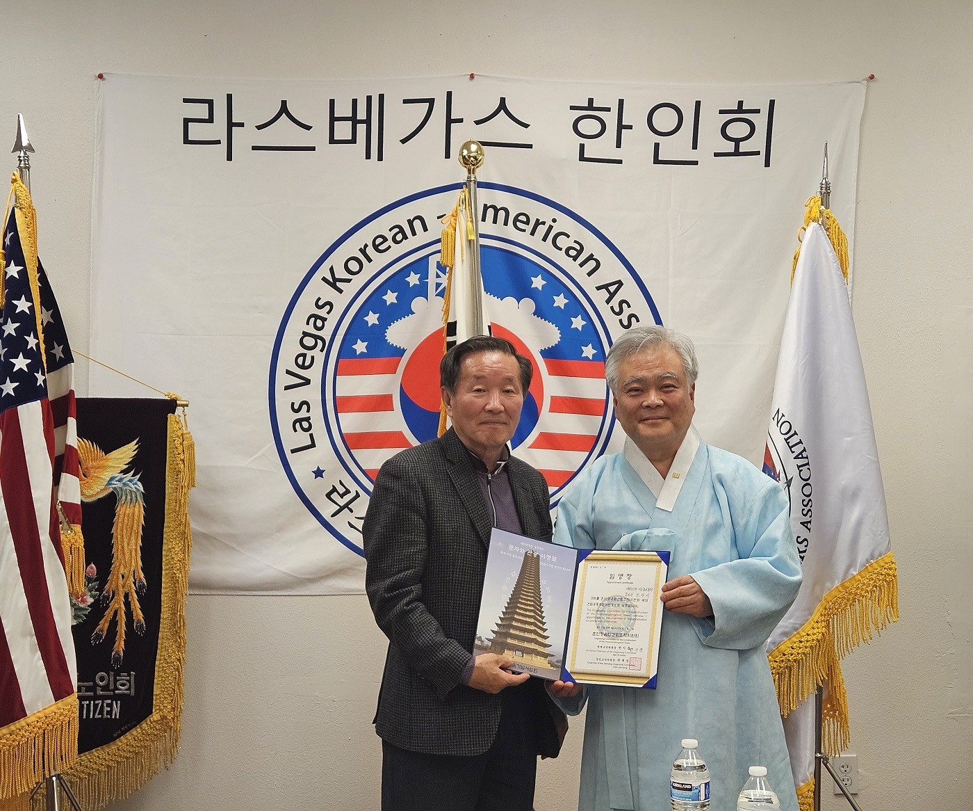 2025년 4월 1일(월) 미국현지 시간 오후 2시 라스베가스 한인회의 초청을 받고 방문한 (사)훈민정음기념사업회 박재성 이사장은 김항호 라스베가스 한인회장과 조광세 대한노인회총연합회 총회장에게 '훈민정음탑 건립조직위원회 해외건립추진위원회 공동추진위원장으로 임명장을 수여하고 정한수 대한민국재향군인회 라스베가스 분회장에게 저서를 증정하였다.