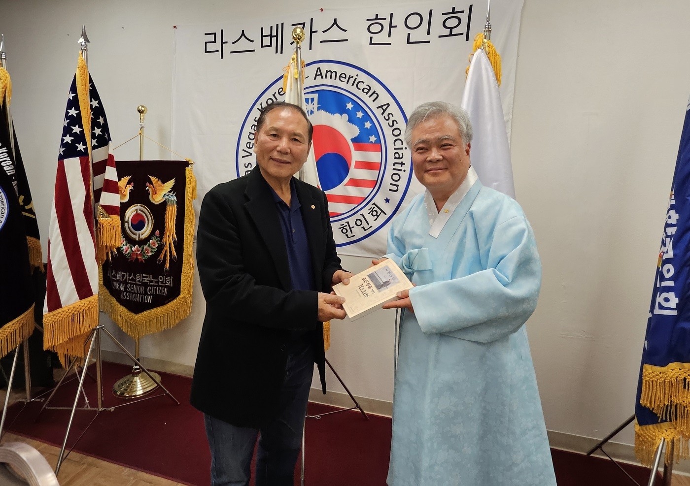 ▲ 정한수 대한민국재향군인회 라스베가스 분회장에게 저서 '훈민정음에서 길을 찾는다'를 증정하는 훈정회 박재성 이사장