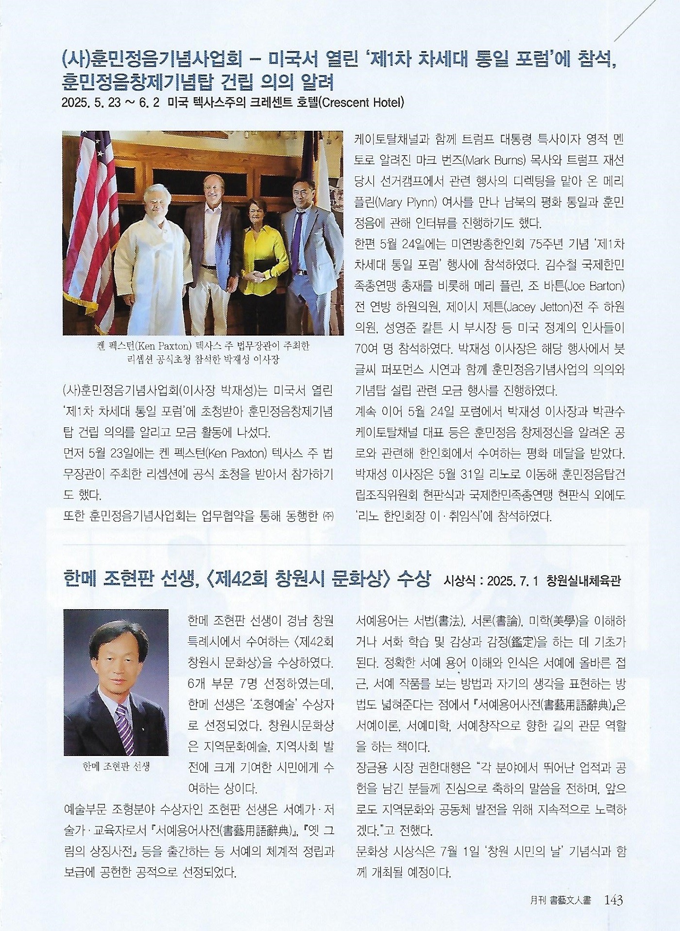 [월간서예문인화] 훈민정음기념사업회, 미국서 열린 '제1차 차세대 통일 포럼' 참석 상세보도