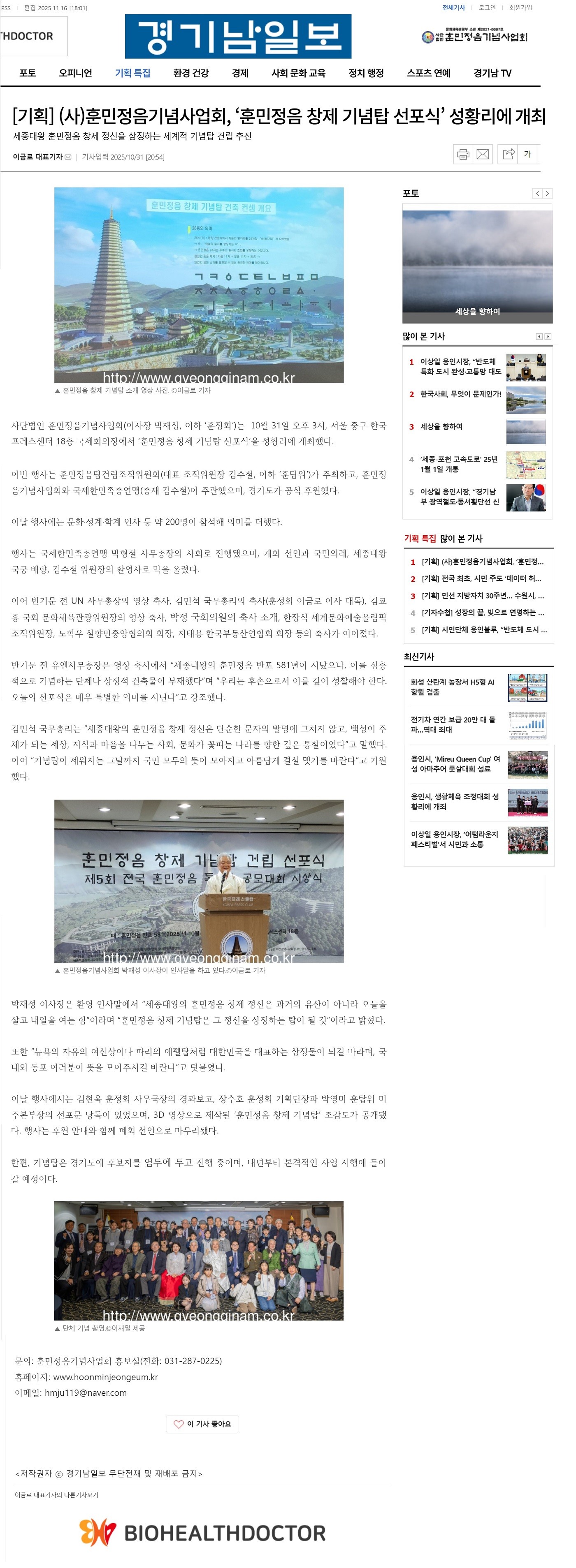 [경기남일보] (사)훈민정음기념사업회, '훈민정음 창제 기념탑 선포식' 성황리에 개최