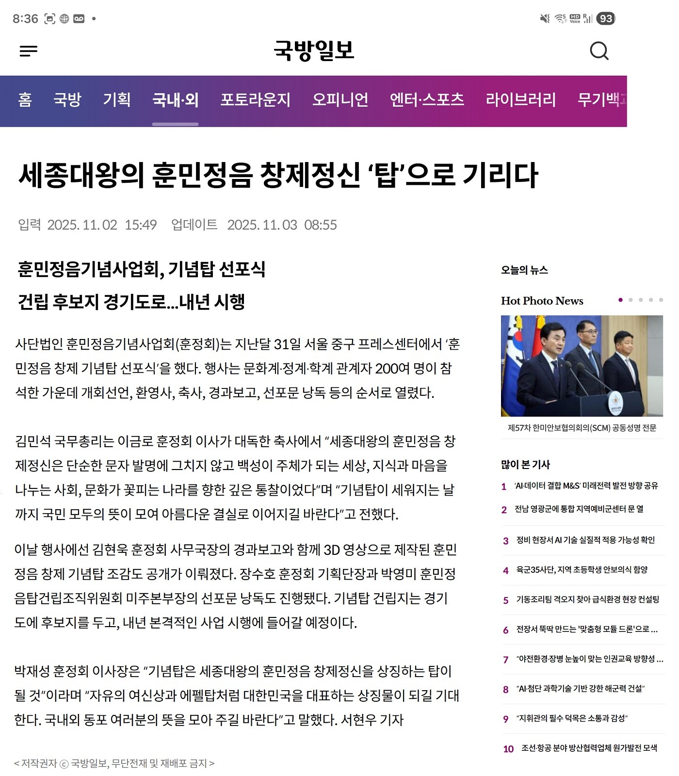 [국방일보] 세종대왕의 훈민정음 창제정신 '탑'으로 기리다