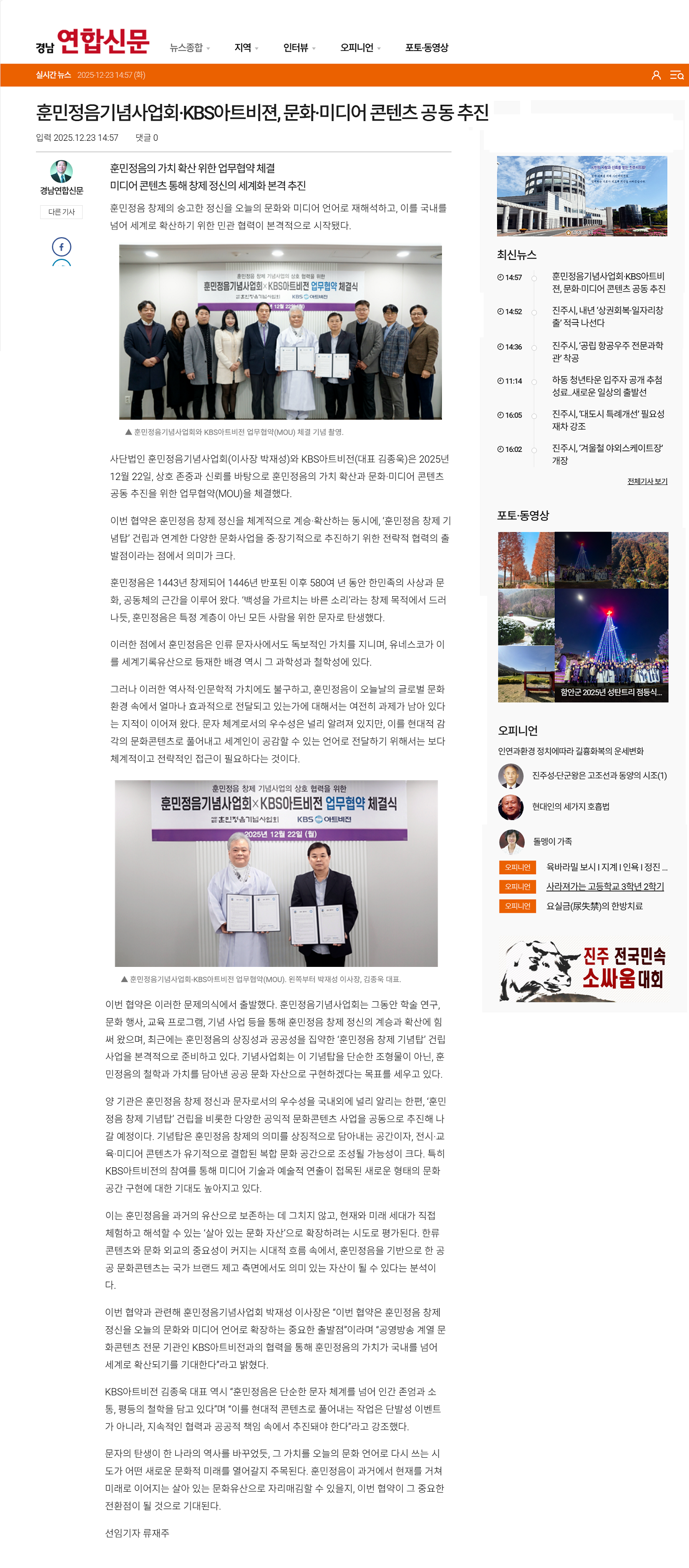 [경남연합신문] 훈민정음기념사업회-KBS아트비젼, 문화.미디어 콘텐츠 공동 추진