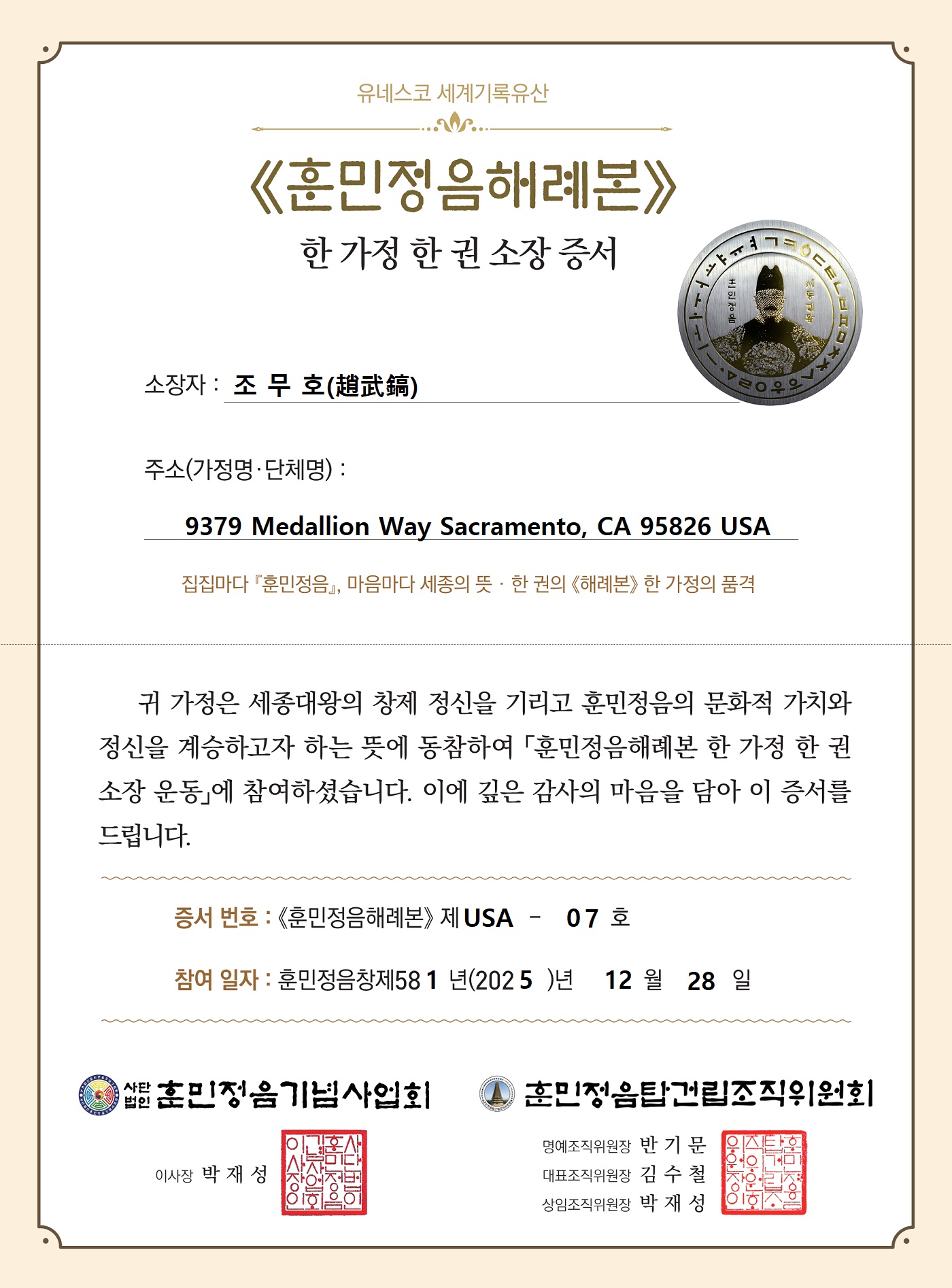 《해례본》 미국 7호 소장자 조무호