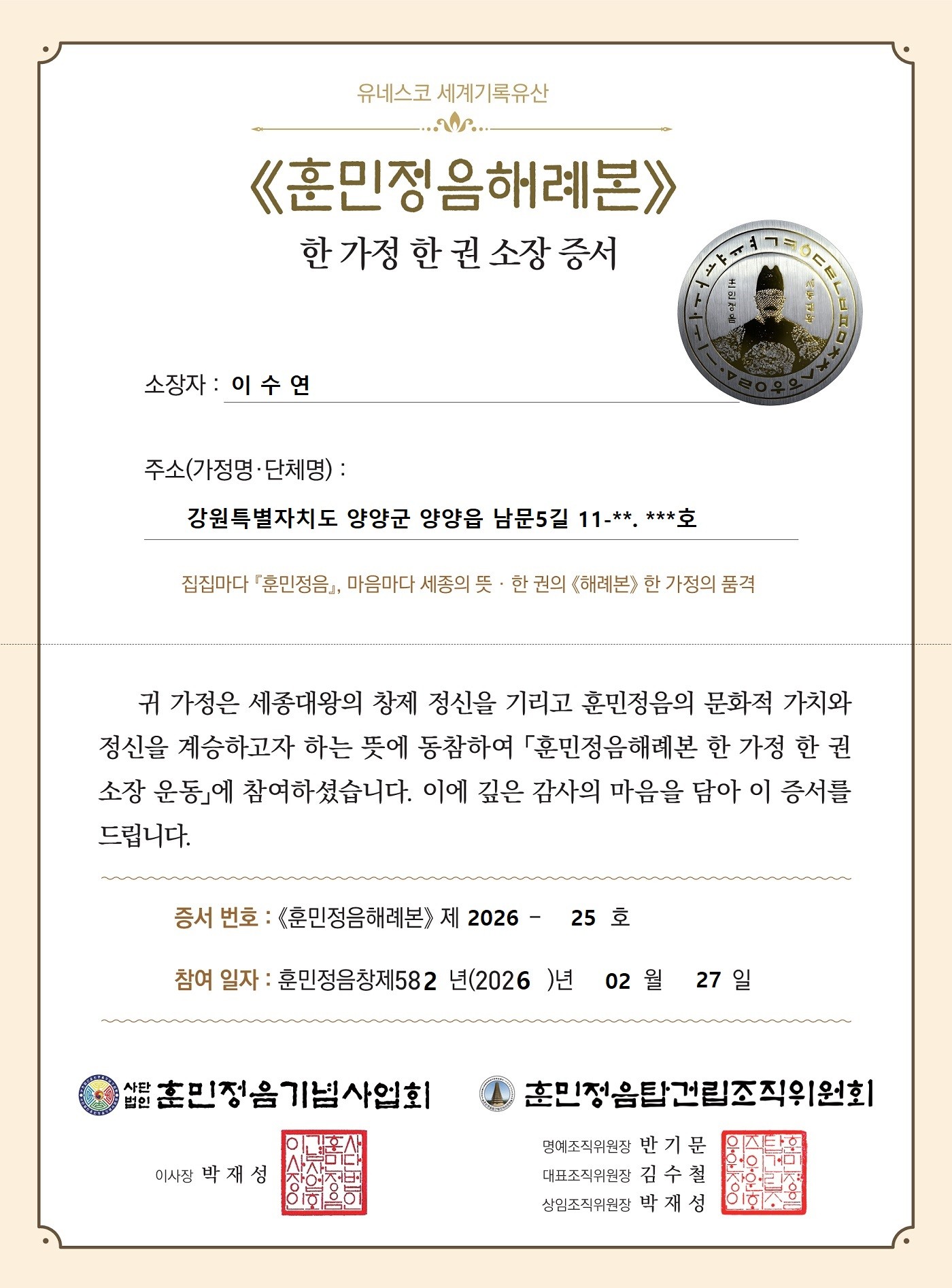《해례본》 25호 소장자 이수연 가족