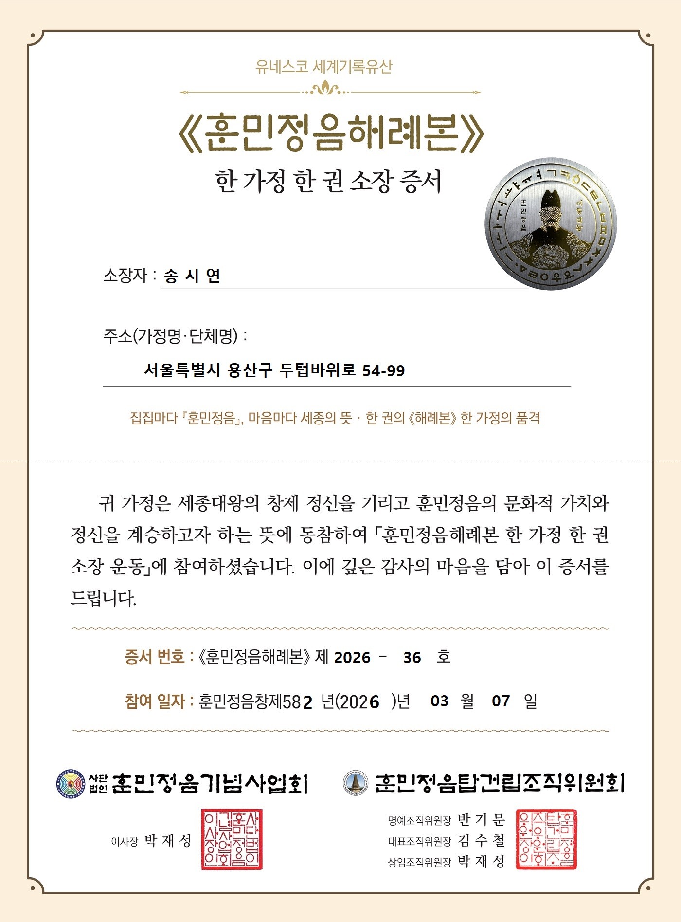 《해례본》 36호 소장자 송시연 국방일보 기자 가족
