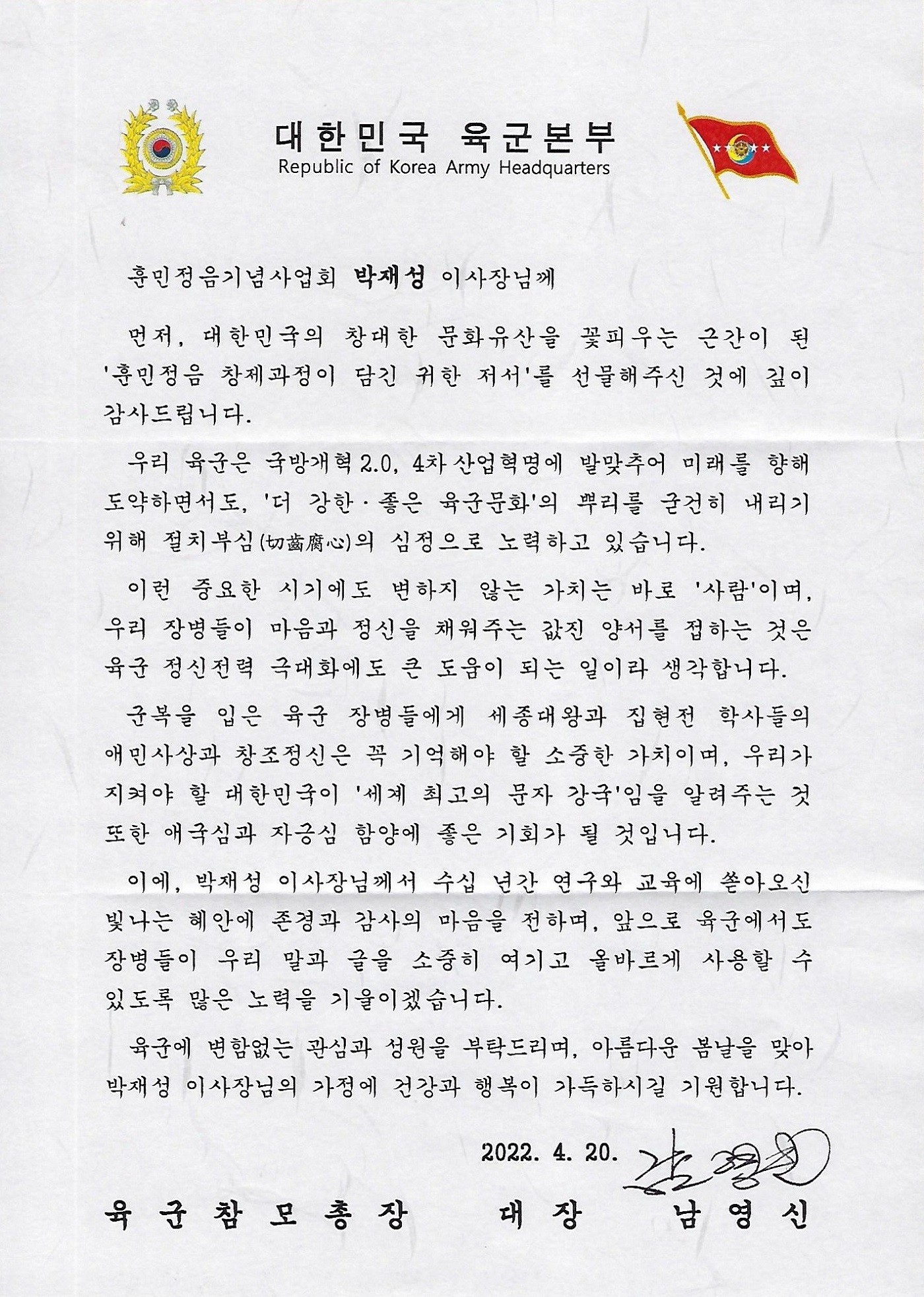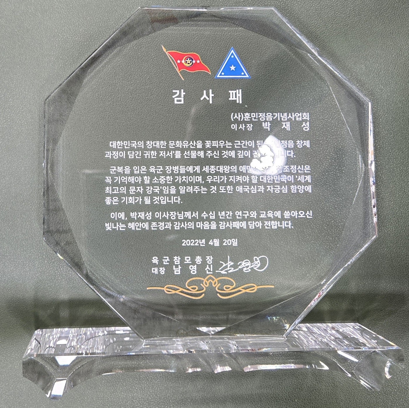 2022년 4월 20일, 사단법인 훈민정음기념사업회 박재성 이사장은 대한민국 제49대 육군참모총장 남영신 대장으로부터 육군 발전과 정신전력 증진에 기여한 공로를 인정받아 감사패와 감사 편지를 받았습니다.