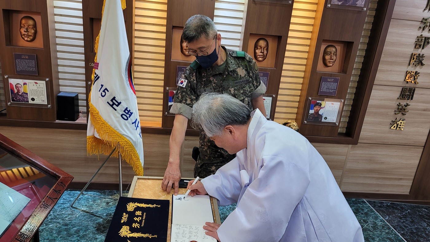 김경중 사단장의 안내를 받으며 15사단 기념관에서 방명록에 서명하는 박재성 이사장