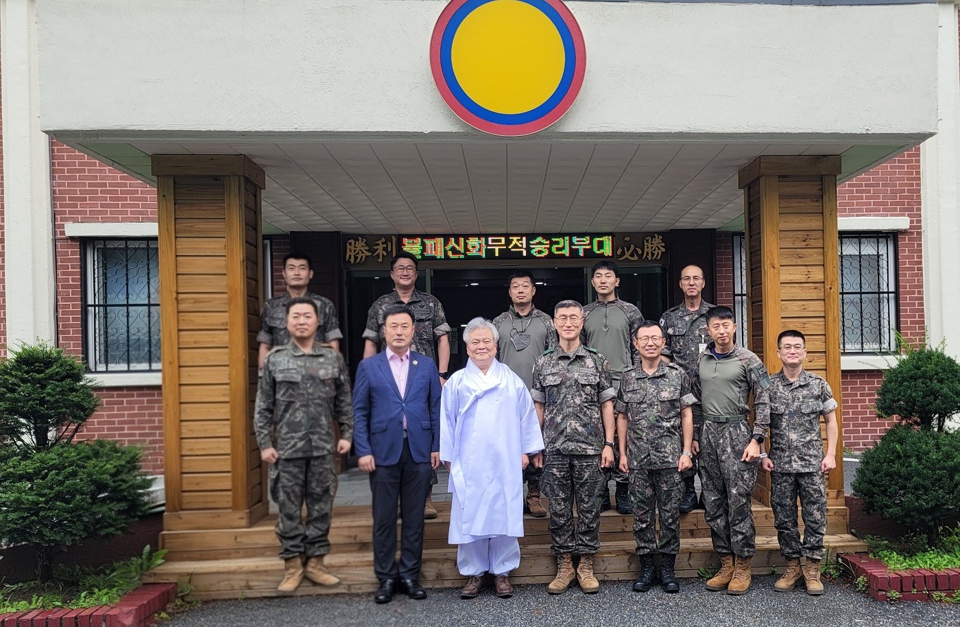15사단 지휘관들의 환영을 받으면서 기념 촬영하는 박재성 이사장