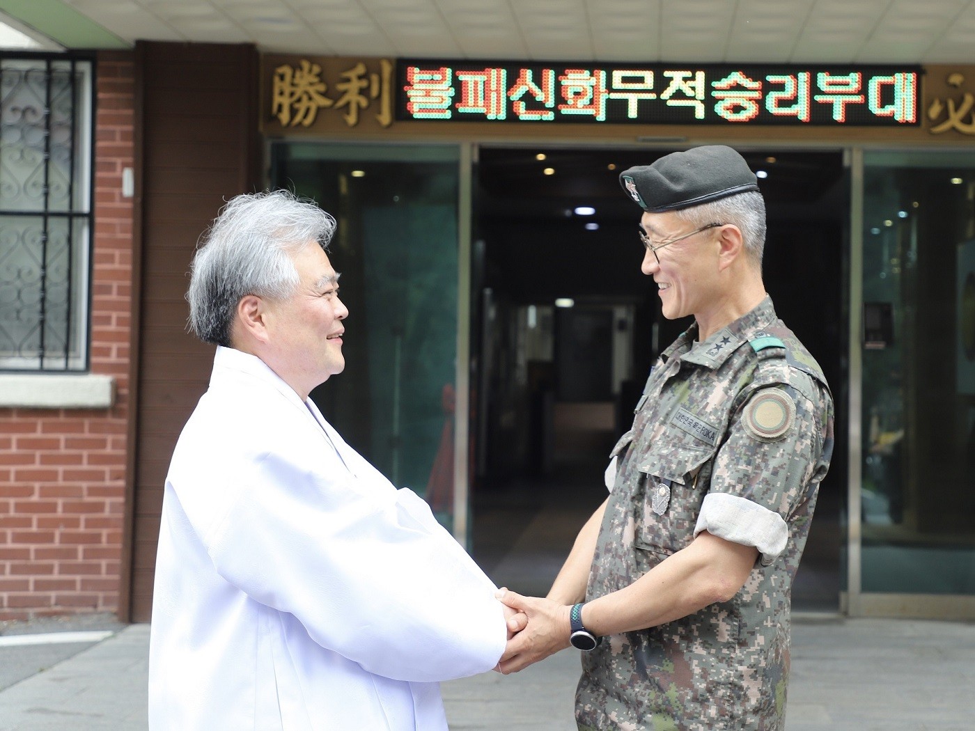박재성 이사장이 40년 전 복무했던 15보병사단을 방문하여 사단장 김경중 소장의 환영을 받고 있다.
