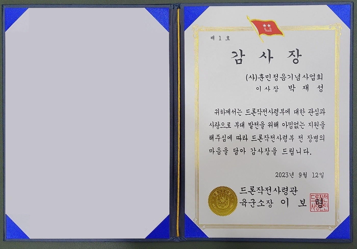 2023년 9월 12일, 드론작전사령부 사령관 이보형 소장은 9월 1일 창설된 드론작전사령부의 부대명을 휘호한 공로로 창설 제1호 감사장을 정훈참모 성하준 소령을 사단법인 훈민정음기념사업회로 보내어 박재성 이사장에게 수여하였습니다.