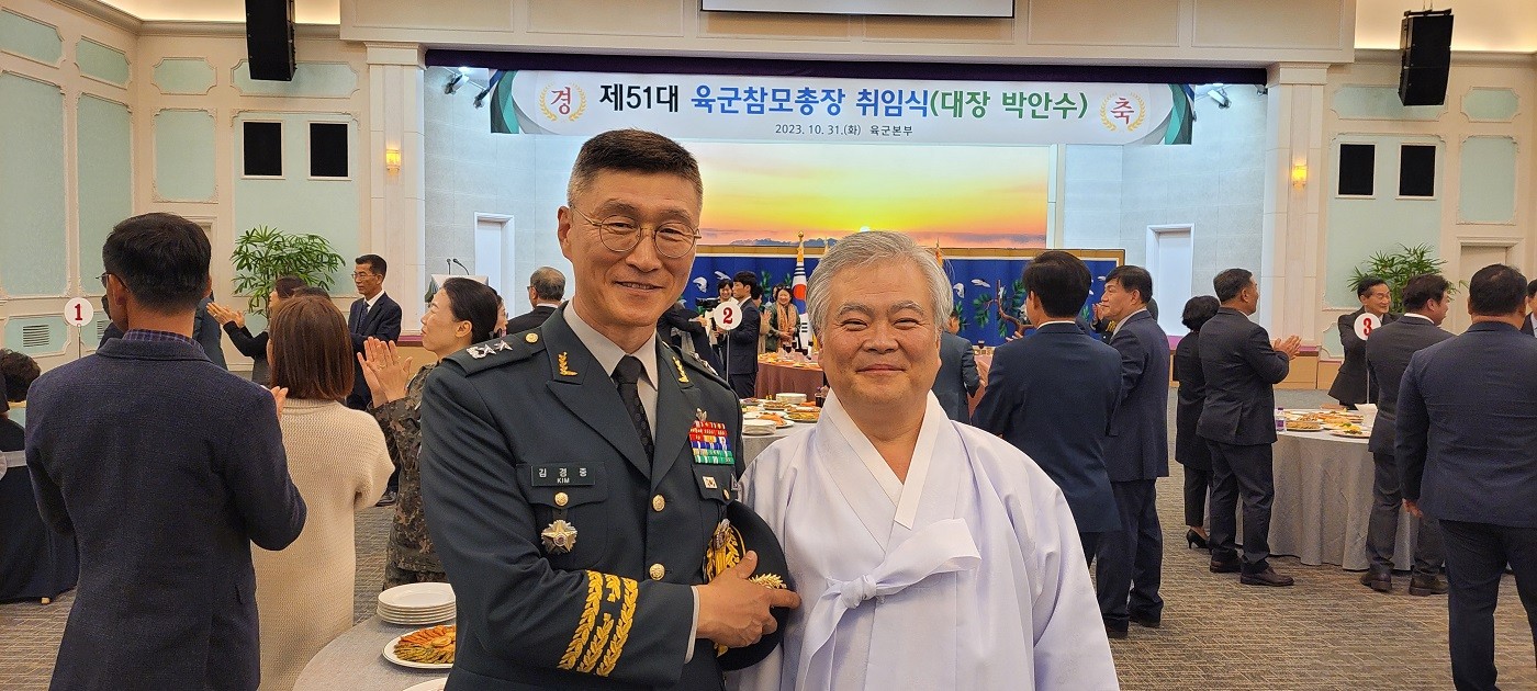 육군참모총장 취임식에서 상봉한 김경중 소장과 기념 촬영하는 박재성 이사장