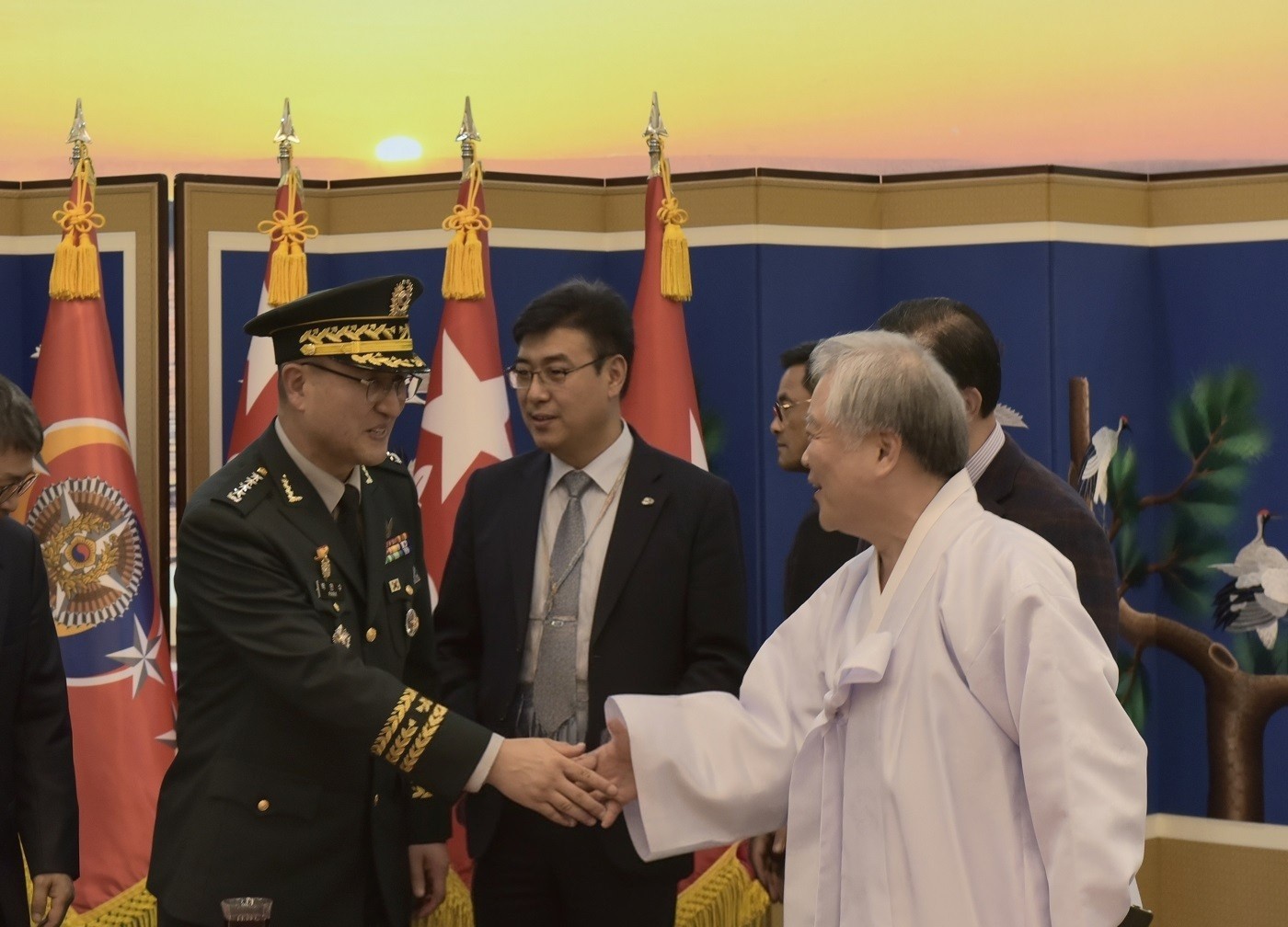 육군참모총장 취임식에서 박안수 대장과 축하 악수를 하는 박재성 이사장