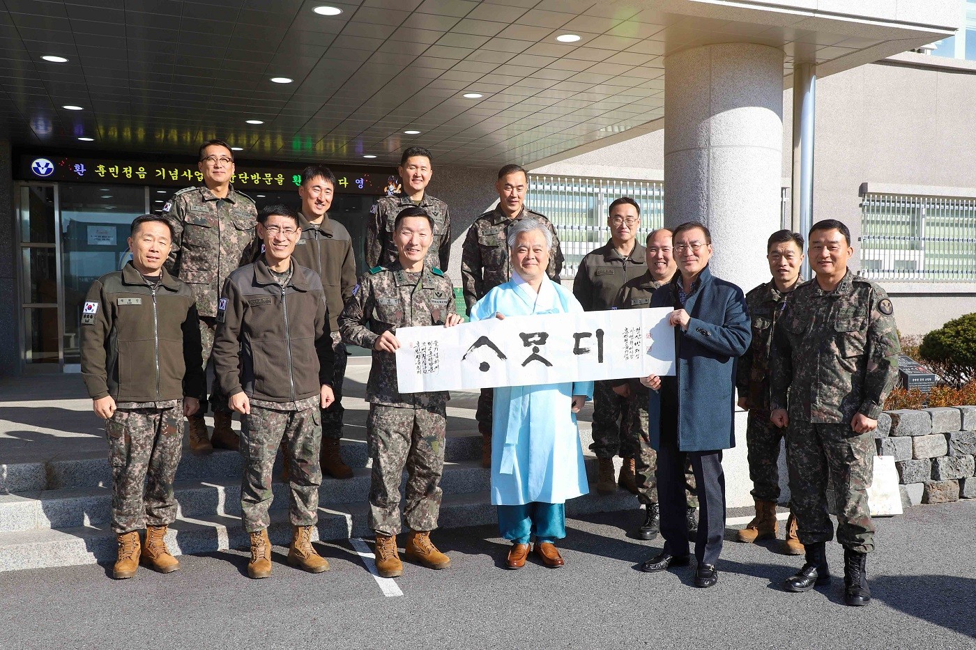 5군단장 김성민 중장에게 '사맛디' 서예 작품을 기증하고 기념 촬영하는 박재성 이사장