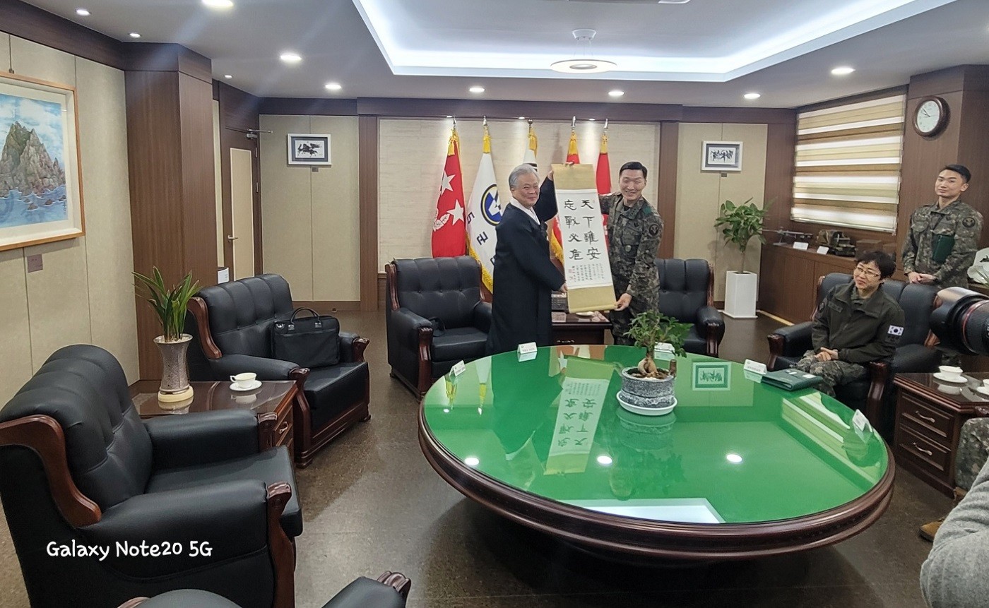 5군단장 김성민 중장에게 서예 족자를 증정하는 박재성 이사장