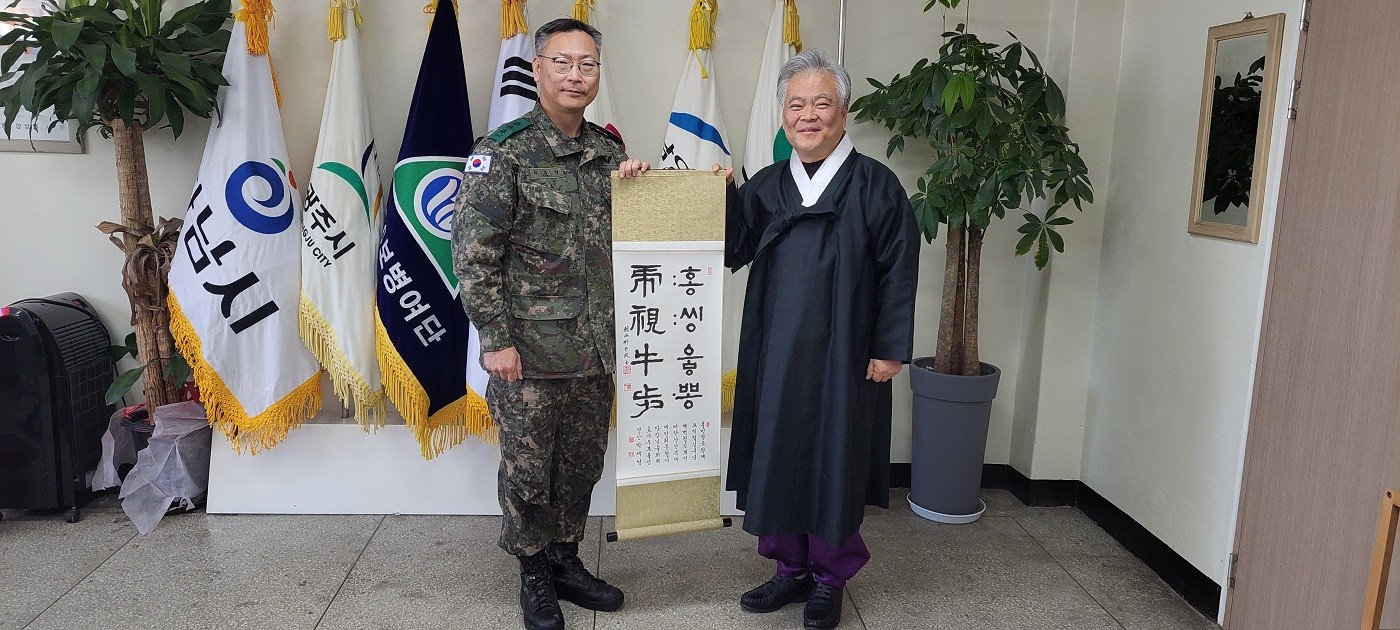 170여단 3대대장 김봉주 중령에게 서예 족자를 증정하는 박재성 이사장