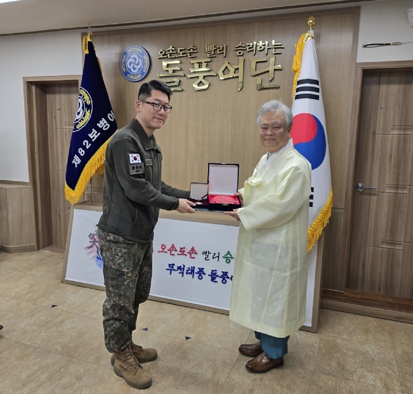 2024년 3월 29일, 제82보병여단장 김정열 대령은 장병 및 지휘관 250여 명을 대상으로 「훈민정음의 오해와 진실」 특강을 진행한 사단법인 훈민정음기념사업회 박재성 이사장에게 감사패를 수여하며 감사의 뜻을 전하였습니다.