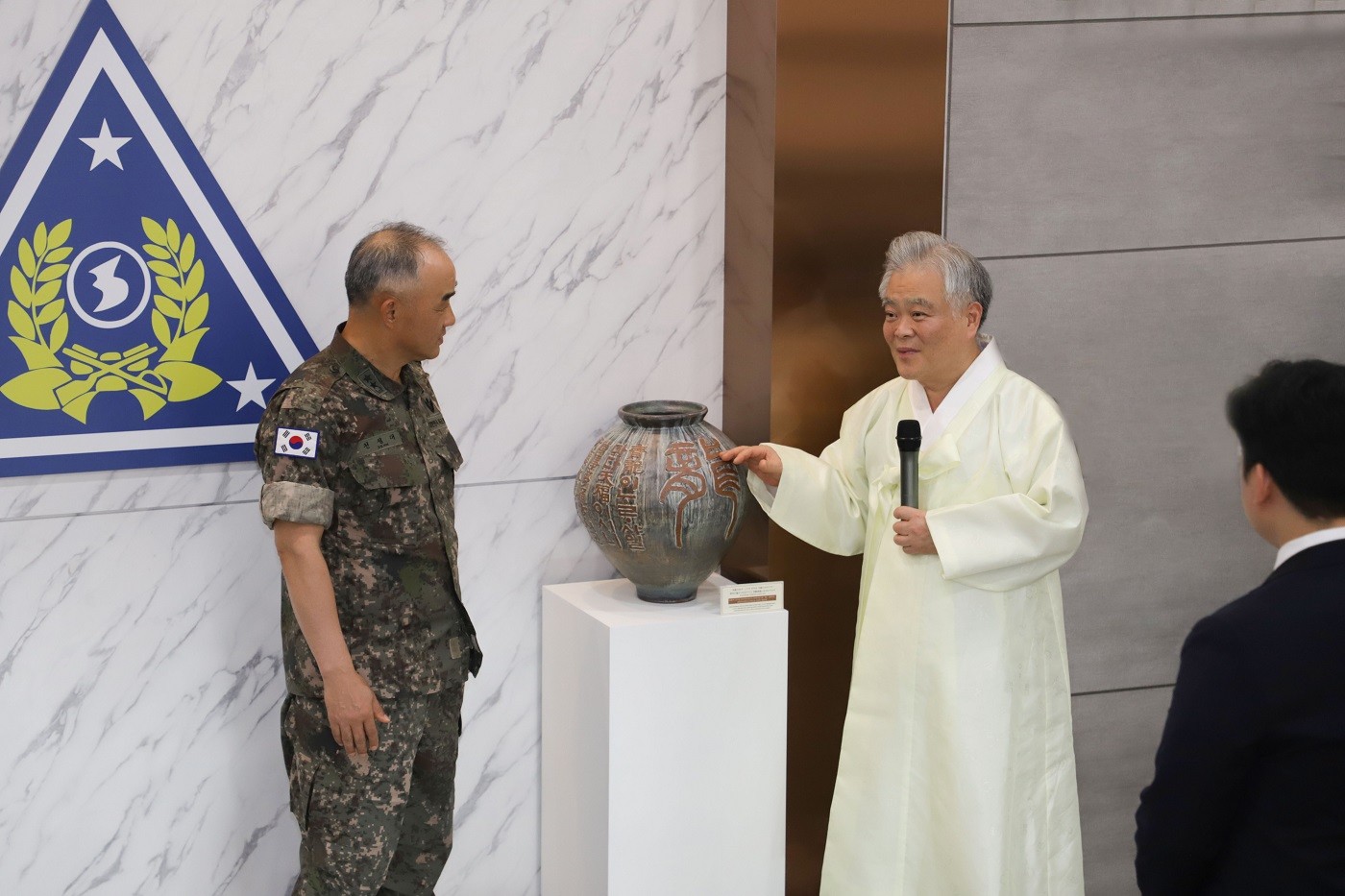 2024년 7월 19일, 사단법인 훈민정음기념사업회 박재성 이사장은 경기도 용인 소재 동원전력사령부 사령관 전성대 소장의 초청으로 부대를 방문하여 “청룡이 나르샤 일마다 천복이시니…” 문구를 직접 휘호한 대형 서예 도자기 작품을 기증하면서 작품 제작 과정을 설명하였습니다. 전성대 사령관은 박재성 이사장에게 감사패를 수여하며 감사의 뜻을 전하였습니다.