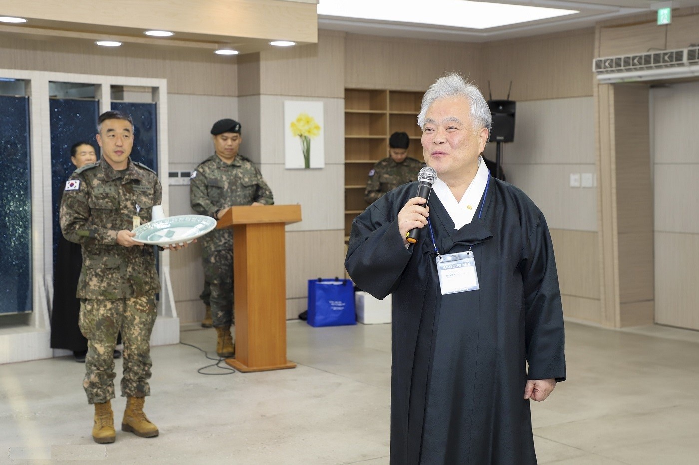 박재성 이사장은 이일용 군단장의 취임을 축하하며 5군단 로고가 새겨진 기념 도자기를 증정하였습니다.