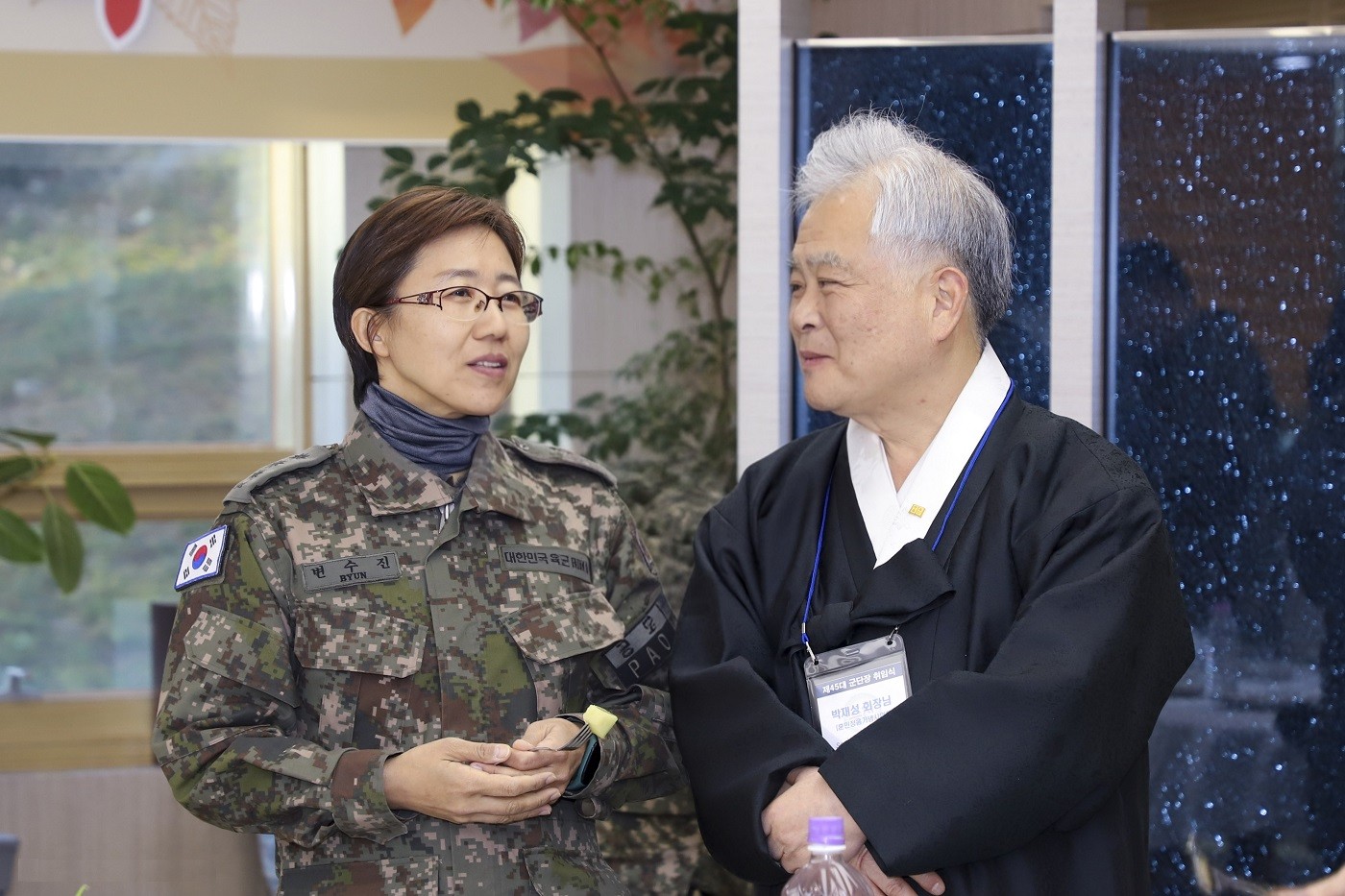 5군단장 이일용 중장 취임식에서 다과 중 5군단 정훈실장 변수진 대령과 환담하는 박재성 이사장
