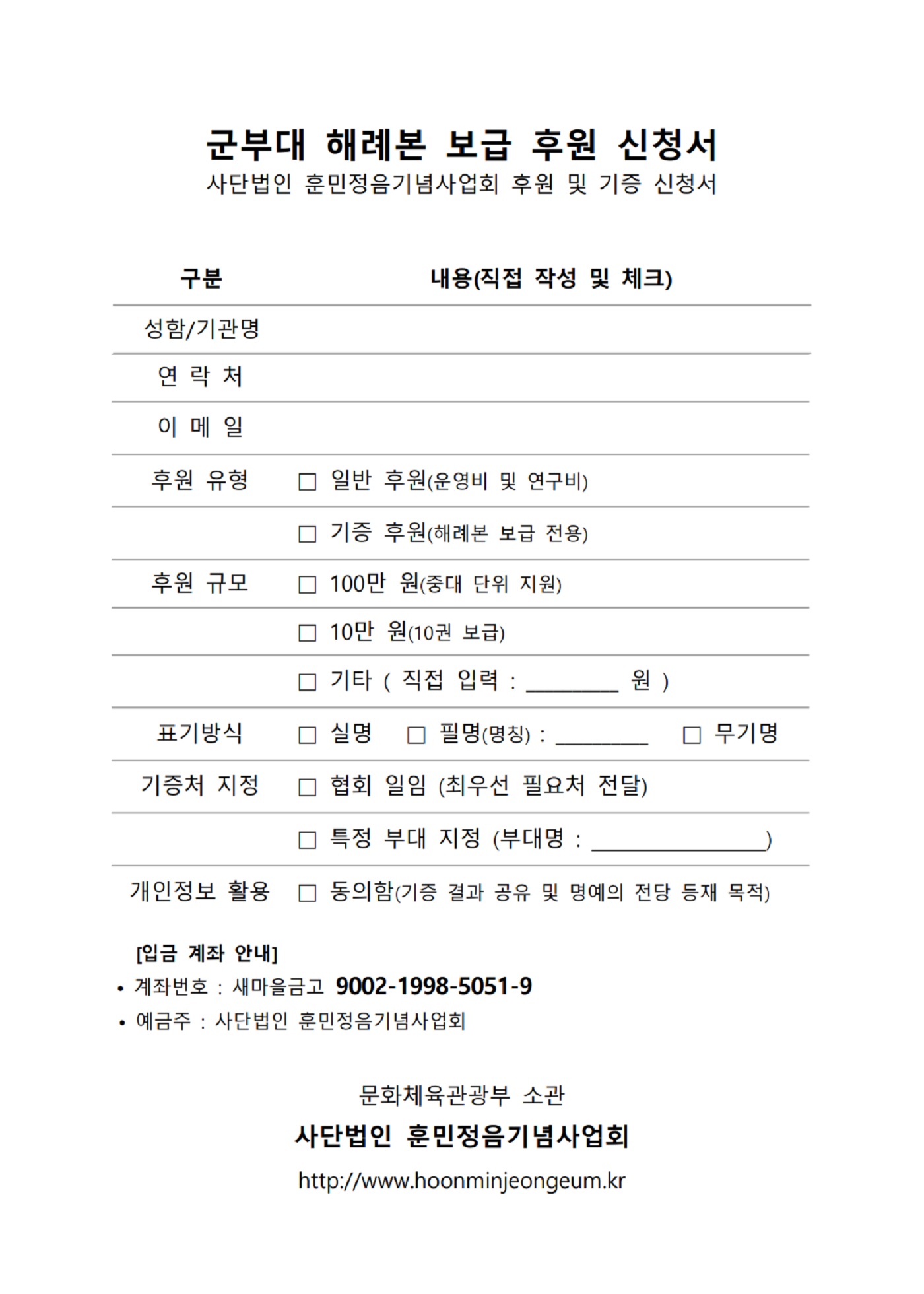 군부대 해례본 보급 후원 신청서