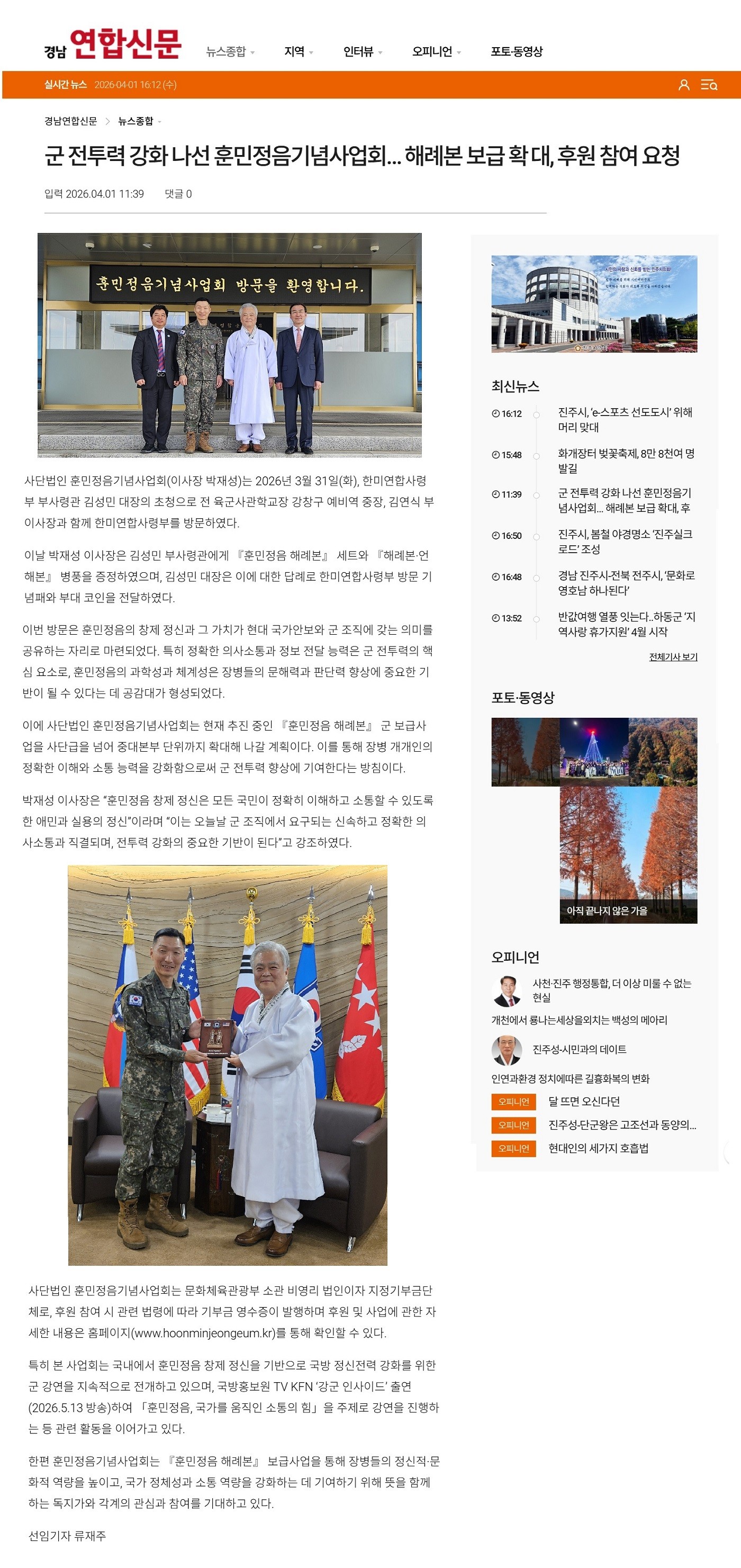 [경남연합신문] 군 전투력 강화 나선 훈민정음기념사업회