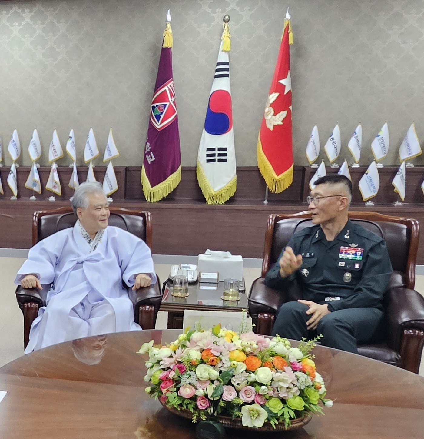 육군부사관학교장 김경중 소장과 훈민정음 정훈 교육에 대해서 환담하는 박재성 이사장