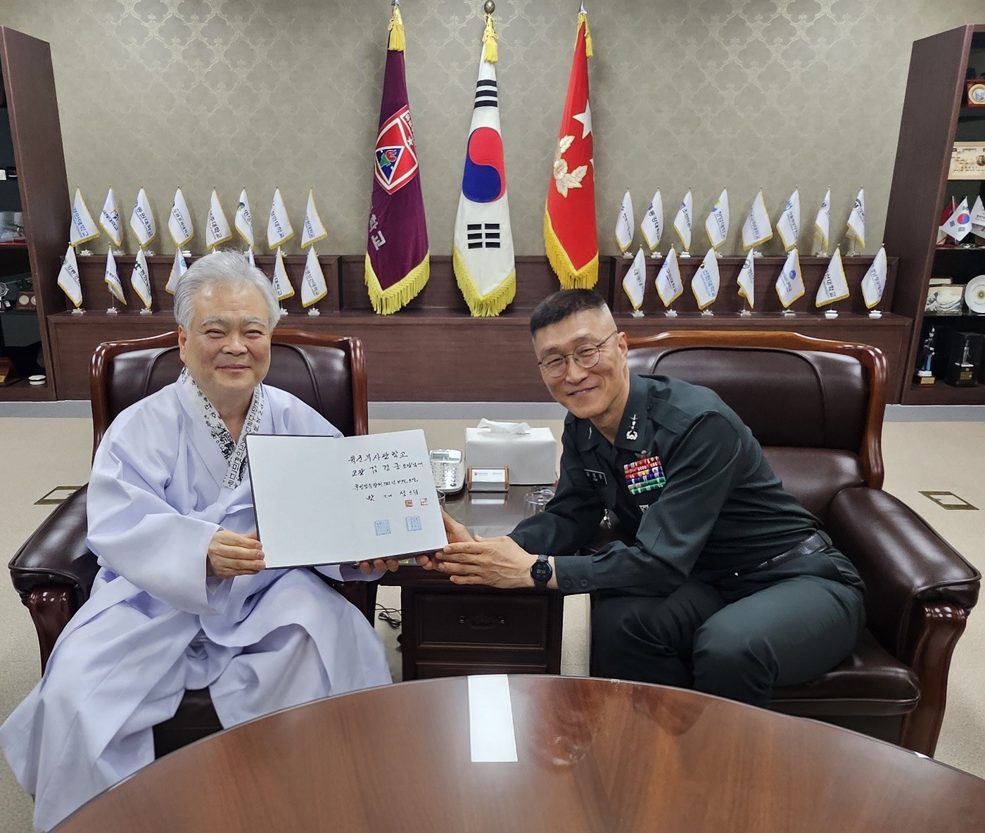 육군부사관학교장 김경중 소장과 훈민정음 정훈 교육에 대해서 환담하는 박재성 이사장